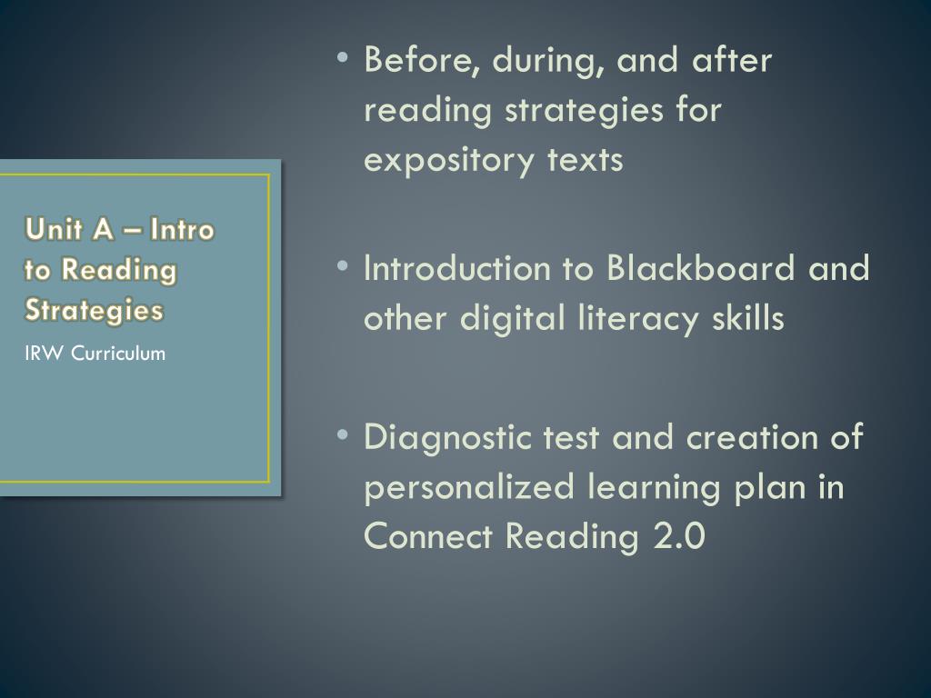 Before, during, and after reading strategies for expository texts • Introduction to Blackboard and other digital literacy skills • Diagnostic test and creation of personalized learning plan in Connect Reading 2.0 Unit A – Intro to Reading Strategies IRW Curriculum
