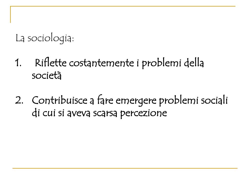 La sociologia: • Riflette costantemente i problemi della società • Contribuisce a fare emergere problemi sociali di cui si aveva scarsa percezione
