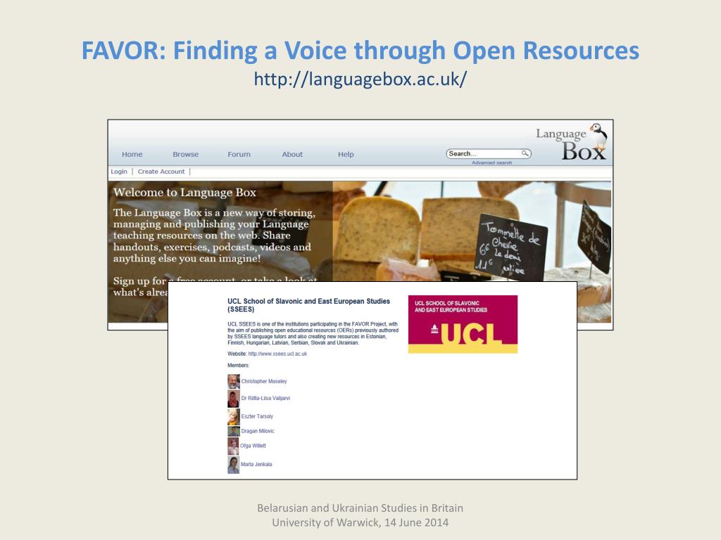 FAVOR: Finding a Voice through Open Resourceshttp://languagebox.ac.uk/ Belarusian and Ukrainian Studies in Britain University of Warwick, 14 June 2014