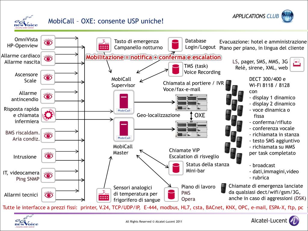 MobiCall – OXE: consente USP uniche! OmniVista HP-Openview Database Login/Logout Tasto di emergenza Campanellonotturno Evacuazione: hotel eamministrazione Piano per piano, in lingua del cliente Allarmecardiaco Allarmenascita Mobilitazione = notifica + confermae escalation LS, pager, SMS, MMS, 3G Relè, sirene, XML, web TMS (task) Voice Recording Ascensore Scale MobiCall Supervisor DECT 300/400 e Wi-Fi 8118 / 8128 con - display 1 dinamico - display 2 dinamico - voce dinamica o fissa - conferma/rifiuto - conferenzavocale - richiamata in stanza - testo SMS aggiuntivo - richiamatasu MMS per task completato - broadcast - dati,immagini,video - rubrica Chiamata al portiere / IVR Voce/fax-e-mail Allarme antincendio Rispostarapida e chiamata infermiera Geo-localizzazione OXE BMS riscaldam. Aria condiz. MobiCall Master Chiamate VIP Escalation di risveglio Intrusione Status della stanza Mini-bar IT, videocamera Ping SNMP Chiamate di emergenzalanciateda qualsiasidect/wifi/gsm/3G,anche in caso di aggressioni(DSK) Piano di lavoro PMS Opera Sensorianalogici di temperatura per frigorifero di sangue Allarmitecnici Tutte le interfacce a prezzifissi: printer, V.24, TCP/UDP/IP, E-444, modbus, HL7, csta, BACnet, KNX, OPC, e-mail, ESPA-X, ftp, pc