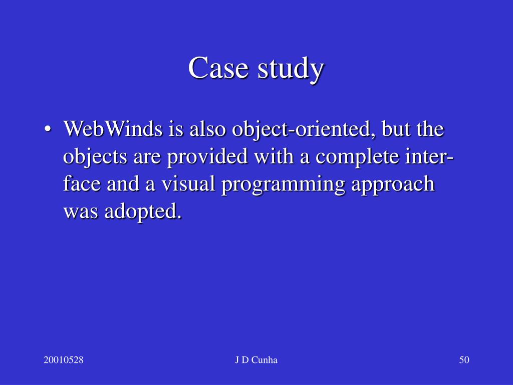 Case study • WebWinds is also object-oriented, but the objects are provided with a complete inter-face and a visual programming approach was adopted. J D Cunha