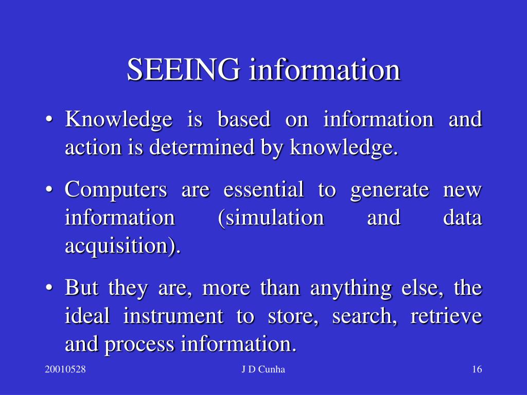 SEEING information • Knowledge is based on information and action is determined by knowledge. • Computers are essential to generate new information (simulation and data acquisition). • But they are, more than anything else, the ideal instrument to store, search, retrieve and process information. J D Cunha