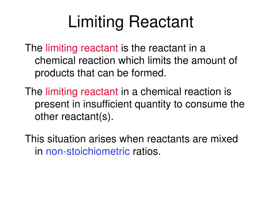 Limiting Reactant The limiting reactant is the reactant in a chemical reaction which limits the amount of products that can be formed. The limiting reactant in a chemical reaction is present in insufficient quantity to consume the other reactant(s). This situation arises when reactants are mixed in non-stoichiometric ratios.