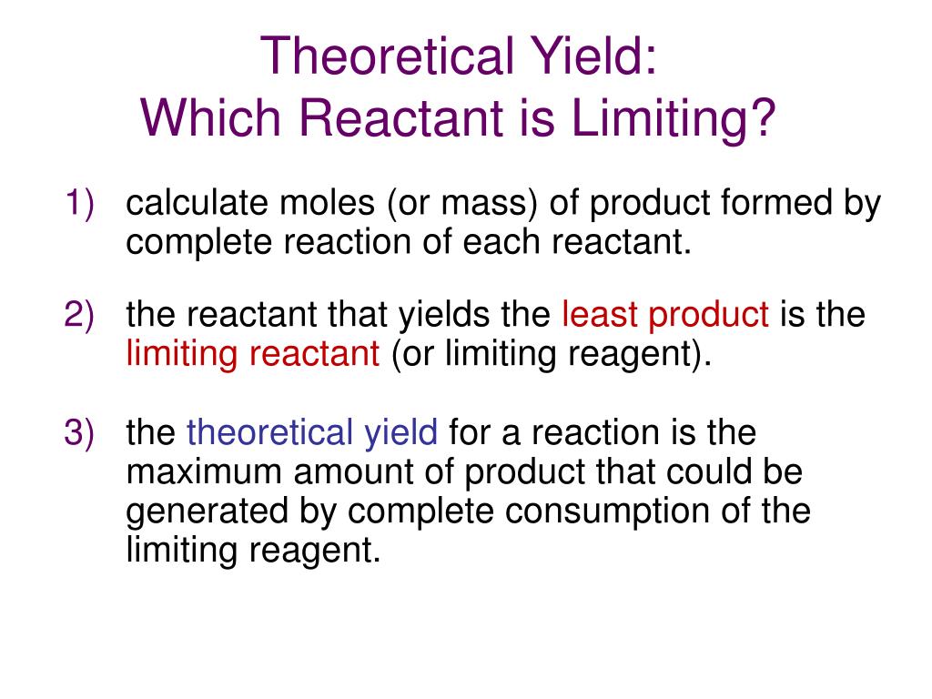 Theoretical Yield: Which Reactant is Limiting? 1) calculate moles (or mass) of product formed by complete reaction of each reactant. 2) the reactant that yields the least product is the limiting reactant (or limiting reagent). 3) the theoretical yield for a reaction is the maximum amount of product that could be generated by complete consumption of the limiting reagent.