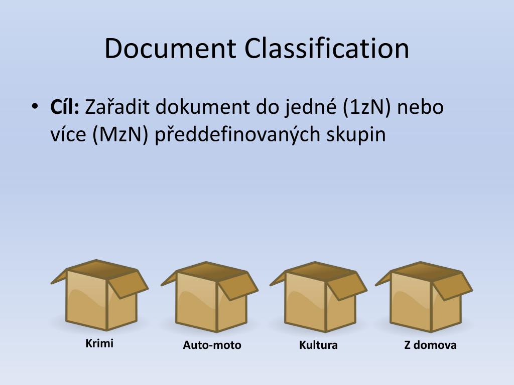 DocumentClassification • Cíl: Zařadit dokument do jedné (1zN) nebo více (MzN) předdefinovaných skupin Krimi Auto-moto Kultura Z domova