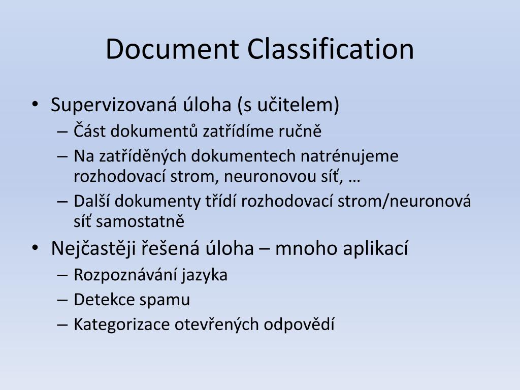DocumentClassification • Supervizovaná úloha (s učitelem) • Část dokumentů zatřídíme ručně • Na zatříděných dokumentech natrénujeme rozhodovací strom, neuronovou síť, … • Další dokumenty třídí rozhodovací strom/neuronová síť samostatně • Nejčastěji řešená úloha – mnoho aplikací • Rozpoznávání jazyka • Detekce spamu • Kategorizace otevřených odpovědí