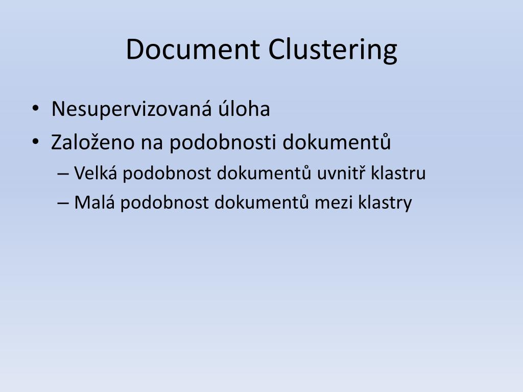 DocumentClustering • Nesupervizovaná úloha • Založeno na podobnosti dokumentů • Velká podobnost dokumentů uvnitř klastru • Malá podobnost dokumentů mezi klastry