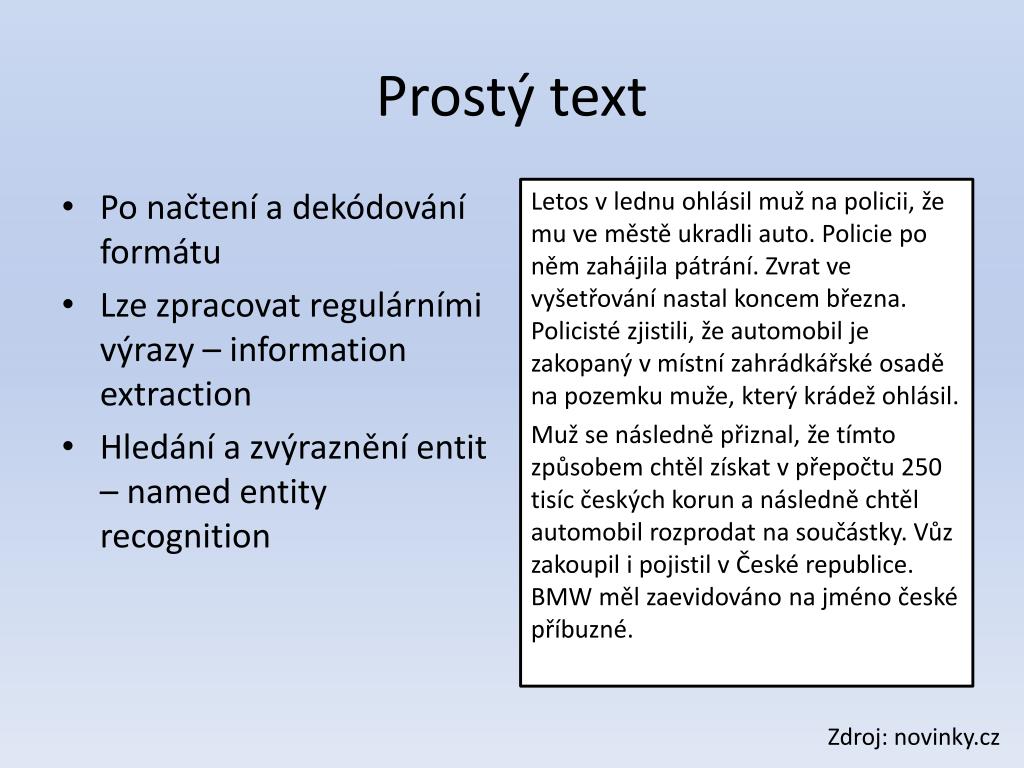 Prostý text • Po načtení a dekódování formátu • Lze zpracovat regulárními výrazy – informationextraction • Hledání a zvýraznění entit – named entity recognition Letos v lednu ohlásil muž na policii, že mu ve městě ukradli auto. Policie po něm zahájila pátrání. Zvrat ve vyšetřování nastal koncem března. Policisté zjistili, že automobil je zakopaný v místní zahrádkářské osadě na pozemku muže, který krádež ohlásil. Muž se následně přiznal, že tímto způsobem chtěl získat v přepočtu 250 tisíc českých korun a následně chtěl automobil rozprodat na součástky. Vůz zakoupil i pojistil v České republice. BMW měl zaevidováno na jméno české příbuzné. Zdroj: novinky.cz