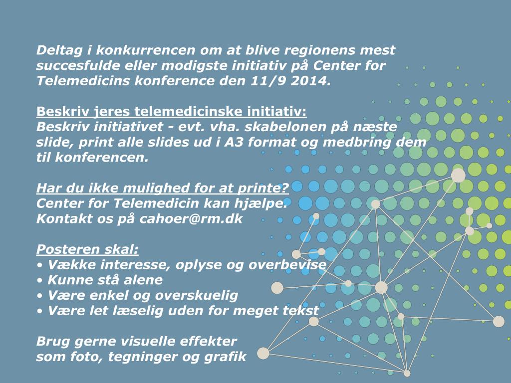 Deltag i konkurrencen om at blive regionens mest succesfulde eller modigste initiativ på Center for Telemedicins konference den 11/9 2014. • Beskriv jeres telemedicinske initiativ: • Beskriv initiativet - evt. vha. skabelonen på næste slide, print alle slides ud i A3 format og medbring dem til konferencen. • Har du ikke mulighed for at printe? • Center for Telemedicin kan hjælpe. • Kontakt os på cahoer@rm.dk • Posteren skal: • Vække interesse, oplyse og overbevise • Kunne stå alene • Være enkel og overskuelig • Være let læselig uden for meget tekst • Brug gerne visuelle effekter • som foto, tegninger og grafik