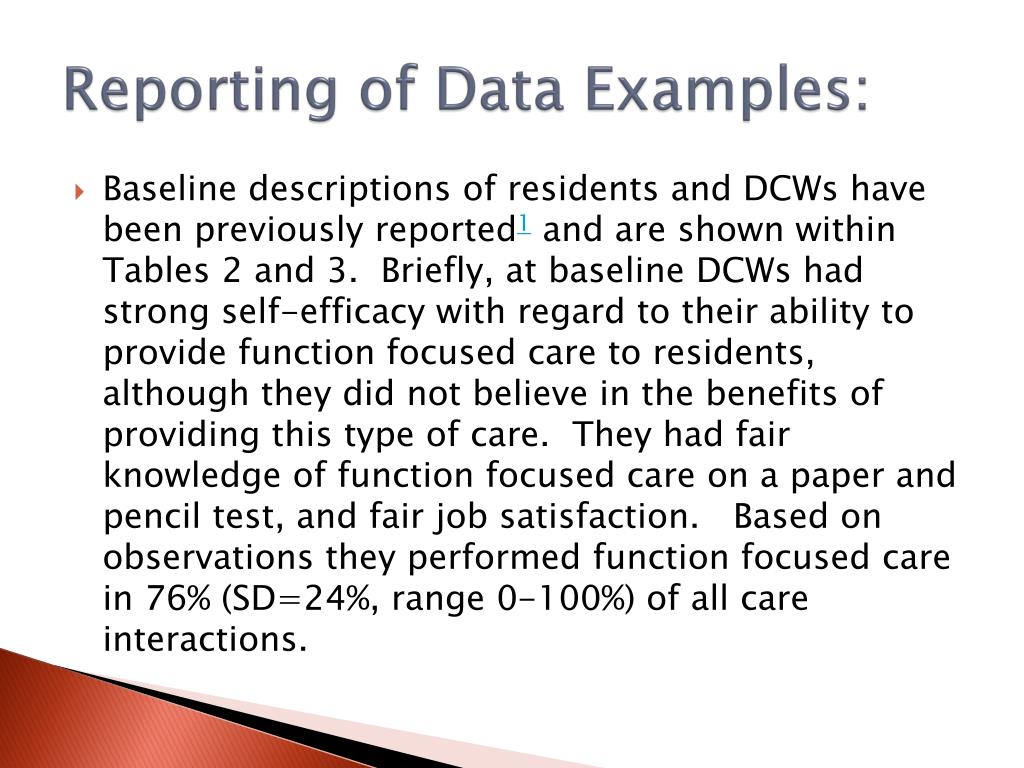 Reporting of Data Examples: • Baseline descriptions of residents and DCWs have been previously reported1 and are shown within Tables 2 and 3. Briefly, at baseline DCWs had strong self-efficacy with regard to their ability to provide function focused care to residents, although they did not believe in the benefits of providing this type of care. They had fair knowledge of function focused care on a paper and pencil test, and fair job satisfaction. Based on observations they performed function focused care in 76% (SD=24%, range 0-100%) of all care interactions.