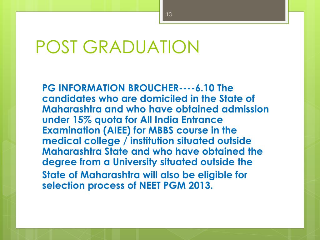 POST GRADUATION PG INFORMATION BROUCHER----6.10 The candidates who are domiciled in the State of Maharashtra and who have obtained admission under 15% quota for All India Entrance Examination (AIEE) for MBBS course in the medical college / institution situated outside Maharashtra State and who have obtained the degree from a University situated outside the State of Maharashtra will also be eligible for selection process of NEET PGM 2013.