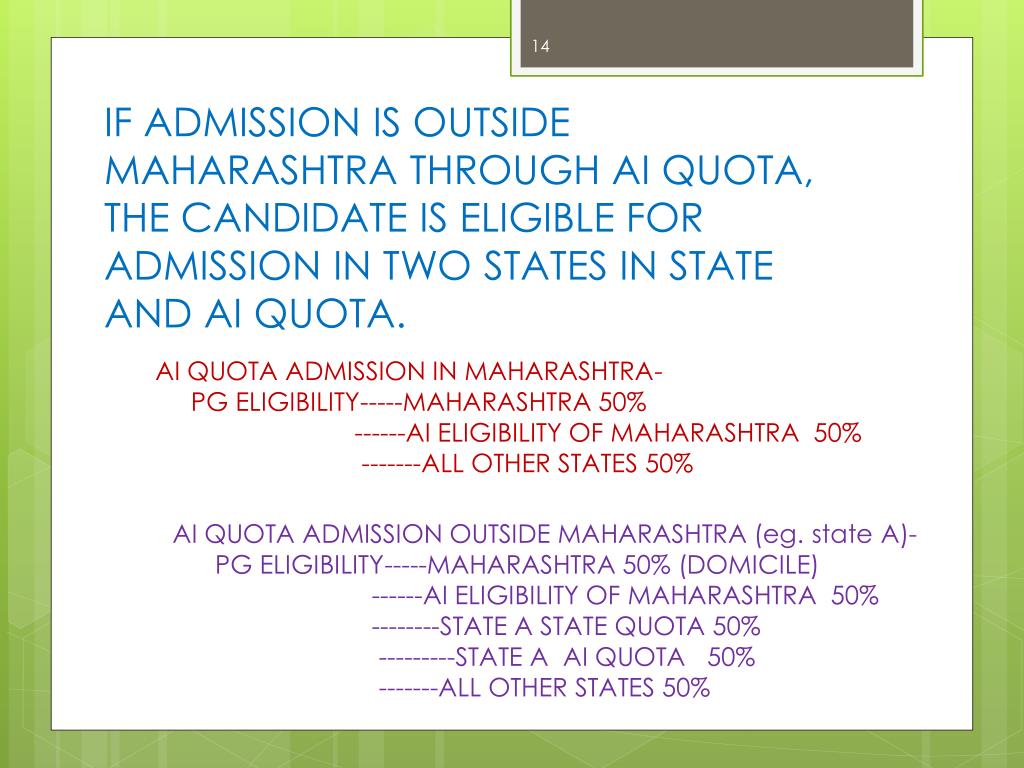 IF ADMISSION IS OUTSIDE MAHARASHTRA THROUGH AI QUOTA, THE CANDIDATE IS ELIGIBLE FOR ADMISSION IN TWO STATES IN STATE AND AI QUOTA. AI QUOTA ADMISSION IN MAHARASHTRA- PG ELIGIBILITY-----MAHARASHTRA 50% ------AI ELIGIBILITY OF MAHARASHTRA 50% -------ALL OTHER STATES 50% AI QUOTA ADMISSION OUTSIDE MAHARASHTRA (eg. state A)- PG ELIGIBILITY-----MAHARASHTRA 50% (DOMICILE) ------AI ELIGIBILITY OF MAHARASHTRA 50% --------STATE A STATE QUOTA 50% ---------STATE A AI QUOTA 50% -------ALL OTHER STATES 50%