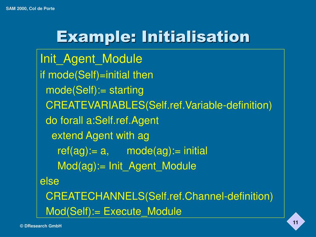 Example: Initialisation Init_Agent_Module if mode(Self)=initial then mode(Self):= starting CREATEVARIABLES(Self.ref.Variable-definition) do forall a:Self.ref.Agent extend Agent with ag ref(ag):= a, mode(ag):= initial Mod(ag):= Init_Agent_Module else CREATECHANNELS(Self.ref.Channel-definition) Mod(Self):= Execute_Module