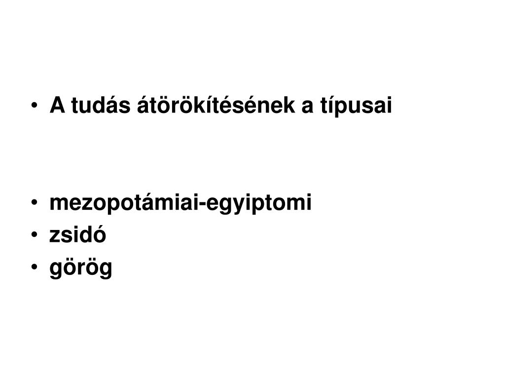 A tudás átörökítésének a típusai • mezopotámiai-egyiptomi • zsidó • görög