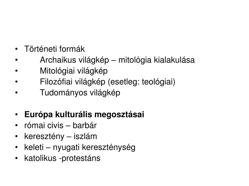 Történeti formák • Archaikus világkép – mitológia kialakulása • Mitológiai világkép • Filozófiai világkép (esetleg: teológiai) • Tudományos világkép • Európa kulturális megosztásai • római civis – barbár • keresztény – iszlám • keleti – nyugati kereszténység • katolikus -protestáns