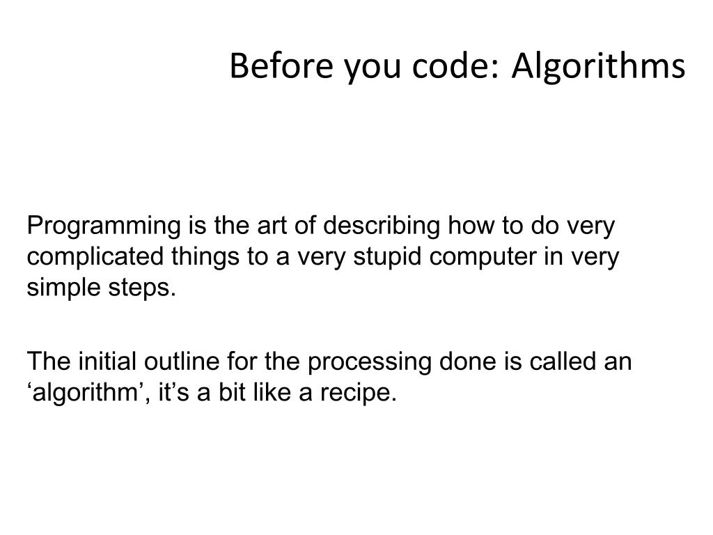 Before you code:Algorithms Programming is the art of describing how to do very complicated things to a very stupid computer in very simple steps. The initial outline for the processing done is called an ‘algorithm’, it’s a bit like a recipe.