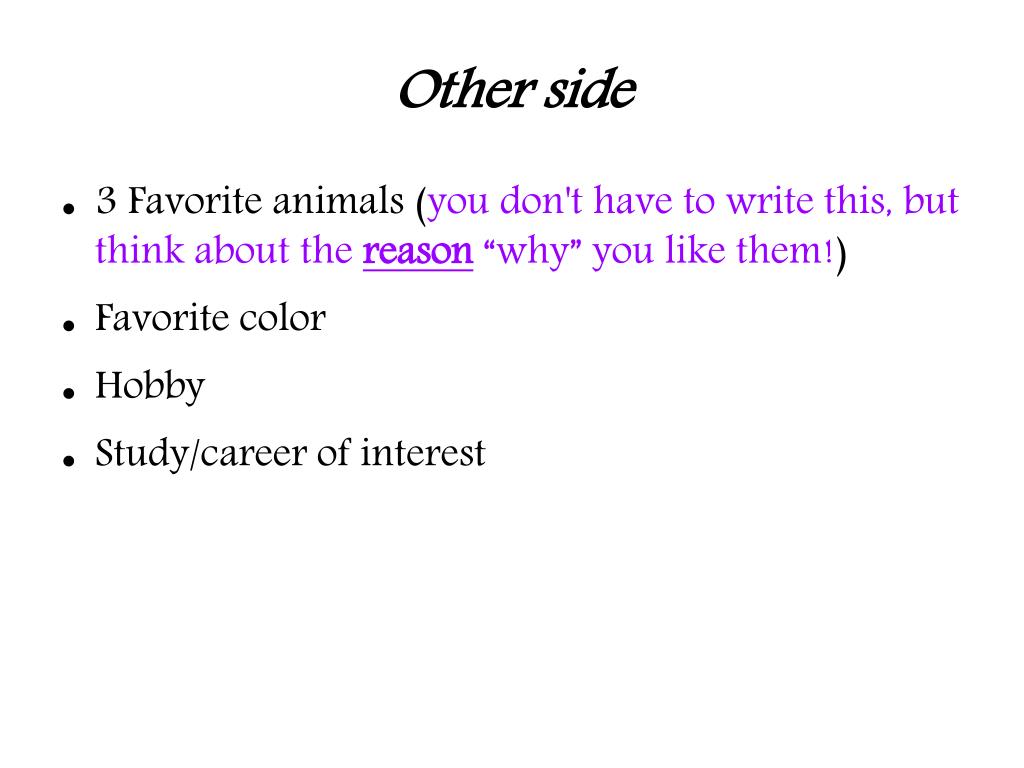 Other side • 3 Favorite animals (you don't have to write this, but think about the reason “why” you like them!) • Favorite color • Hobby • Study/career of interest