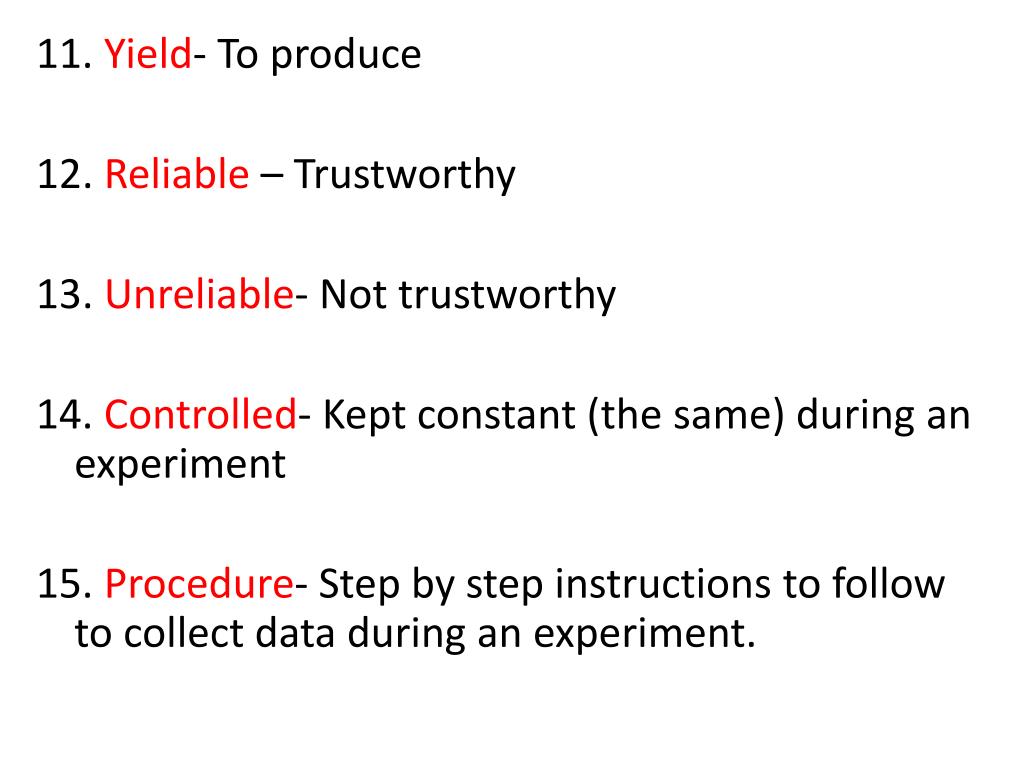 11. Yield- To produce 12. Reliable – Trustworthy 13. Unreliable- Not trustworthy 14. Controlled- Kept constant (the same) during an experiment 15. Procedure- Step by step instructions to follow to collect data during an experiment.