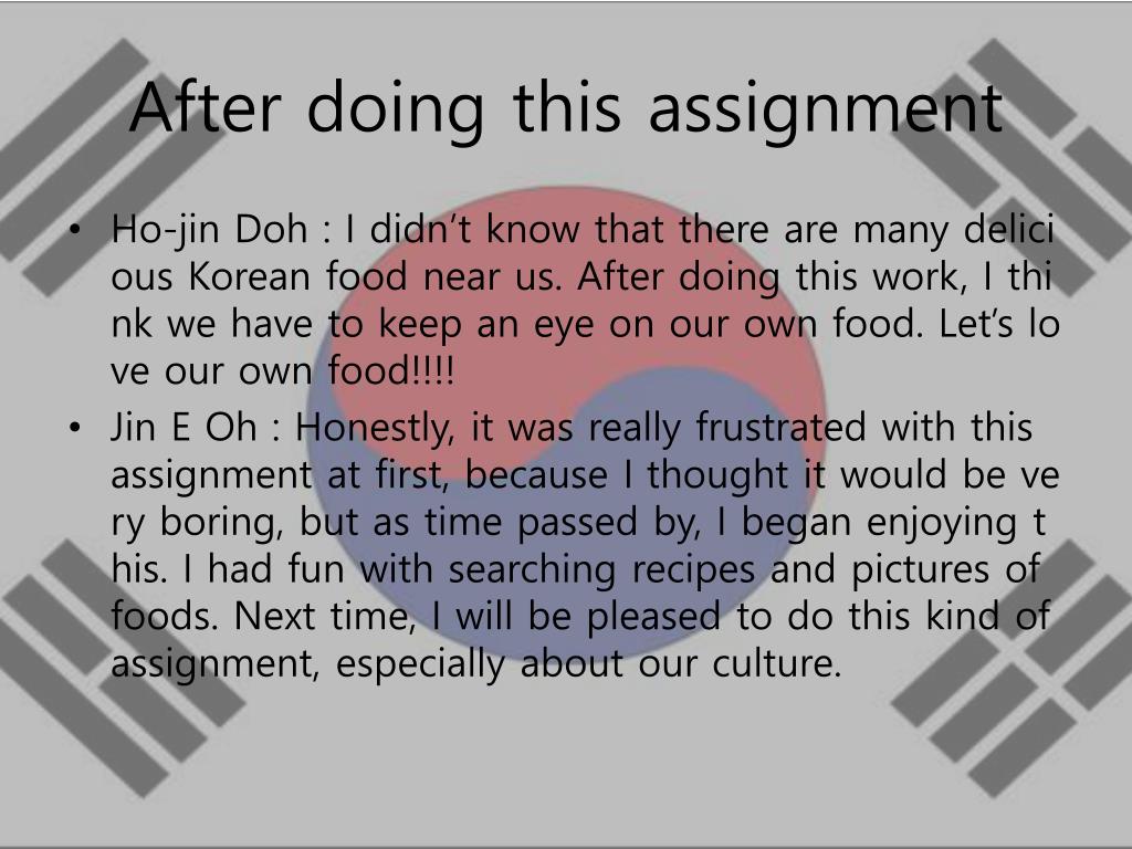 After doing this assignment • Ho-jinDoh : I didn’t know that there are many delicious Korean food near us. After doing this work, I think we have to keep an eye on our own food. Let’s love our own food!!!! • Jin E Oh : Honestly, it was really frustrated with this assignment at first, because I thought it would be very boring, but as time passed by, I began enjoying this. I had fun with searching recipes and pictures of foods. Next time, I will be pleased to do this kind of assignment, especially about our culture.