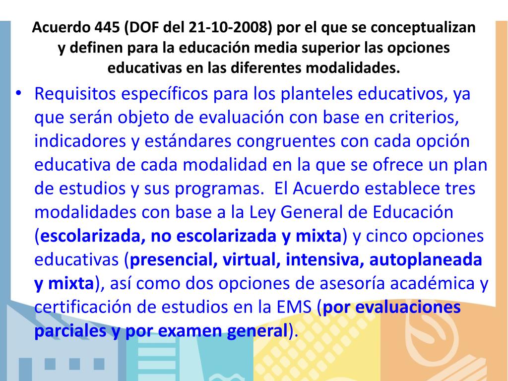 Acuerdo 445 (DOF del 21-10-2008) por el que se conceptualizan y definen para la educación media superior las opciones educativas en las diferentes modalidades. • Requisitos específicos para los planteles educativos, ya que serán objeto de evaluación con base en criterios, indicadores y estándares congruentes con cada opción educativa de cada modalidad en la que se ofrece un plan de estudios y sus programas. El Acuerdo establece tres modalidades con base a la Ley General de Educación (escolarizada, no escolarizada y mixta) y cinco opciones educativas (presencial, virtual, intensiva, autoplaneada y mixta), así como dos opciones de asesoría académica y certificación de estudios en la EMS (por evaluaciones parciales y por examen general).