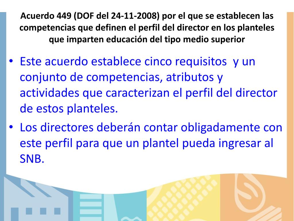 Acuerdo 449 (DOF del 24-11-2008) por el que se establecen las competencias que definen el perfil del director en los planteles que imparten educación del tipo medio superior • Este acuerdo establece cinco requisitos y un conjunto de competencias, atributos y actividades que caracterizan el perfil del director de estos planteles. • Los directores deberán contar obligadamente con este perfil para que un plantel pueda ingresar al SNB.