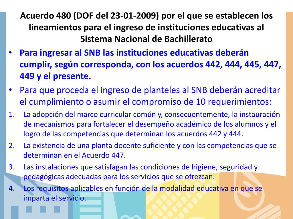 Acuerdo 480 (DOF del 23-01-2009) por el que se establecen los lineamientos para el ingreso de instituciones educativas al Sistema Nacional de Bachillerato • Para ingresar al SNB las instituciones educativas deberán cumplir, según corresponda, con los acuerdos 442, 444, 445, 447, 449 y el presente. • Para que proceda el ingreso de planteles al SNB deberán acreditar el cumplimiento o asumir el compromiso de 10 requerimientos: • La adopción del marco curricular común y, consecuentemente, la instauración de mecanismos para fortalecer el desempeño académico de los alumnos y el logro de las competencias que determinan los acuerdos 442 y 444. • La existencia de una planta docente suficiente y con las competencias que se determinan en el Acuerdo 447. • Las instalaciones que satisfagan las condiciones de higiene, seguridad y pedagógicas adecuadas para los servicios que se ofrezcan. • Los requisitos aplicables en función de la modalidad educativa en que se imparta el servicio.