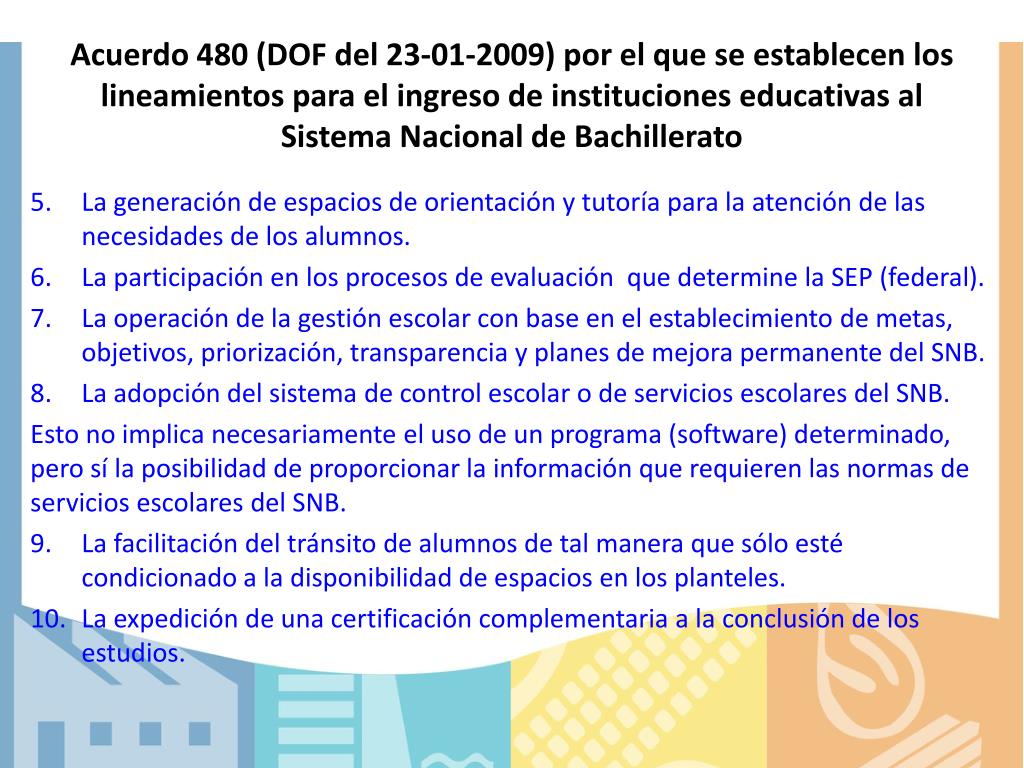 Acuerdo 480 (DOF del 23-01-2009) por el que se establecen los lineamientos para el ingreso de instituciones educativas al Sistema Nacional de Bachillerato • La generación de espacios de orientación y tutoría para la atención de las necesidades de los alumnos. • La participación en los procesos de evaluación que determine la SEP (federal). • La operación de la gestión escolar con base en el establecimiento de metas, objetivos, priorización, transparencia y planes de mejora permanente del SNB. • La adopción del sistema de control escolar o de servicios escolares del SNB. Esto no implica necesariamente el uso de un programa (software) determinado, pero sí la posibilidad de proporcionar la información que requieren las normas de servicios escolares del SNB. • La facilitación del tránsito de alumnos de tal manera que sólo esté condicionado a la disponibilidad de espacios en los planteles. • La expedición de una certificación complementaria a la conclusión de los estudios.