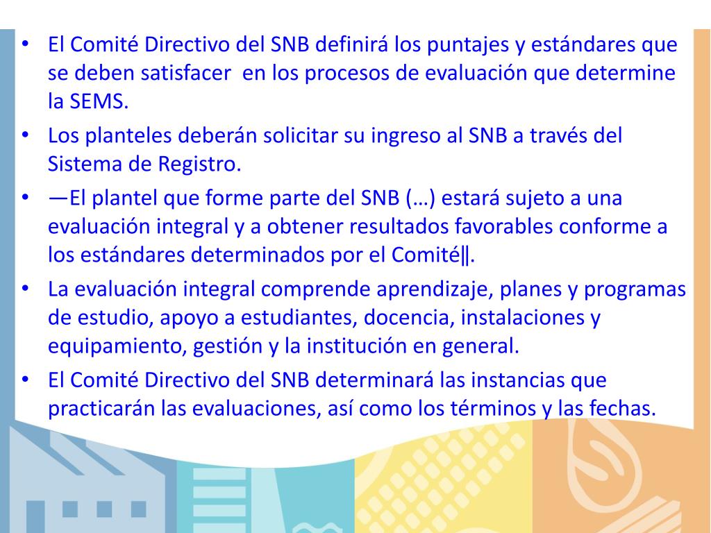 El Comité Directivo del SNB definirá los puntajes y estándares que se deben satisfacer en los procesos de evaluación que determine la SEMS. • Los planteles deberán solicitar su ingreso al SNB a través del Sistema de Registro. • ―El plantel que forme parte del SNB (…) estará sujeto a una evaluación integral y a obtener resultados favorables conforme a los estándares determinados por el Comité‖. • La evaluación integral comprende aprendizaje, planes y programas de estudio, apoyo a estudiantes, docencia, instalaciones y equipamiento, gestión y la institución en general. • El Comité Directivo del SNB determinará las instancias que practicarán las evaluaciones, así como los términos y las fechas.