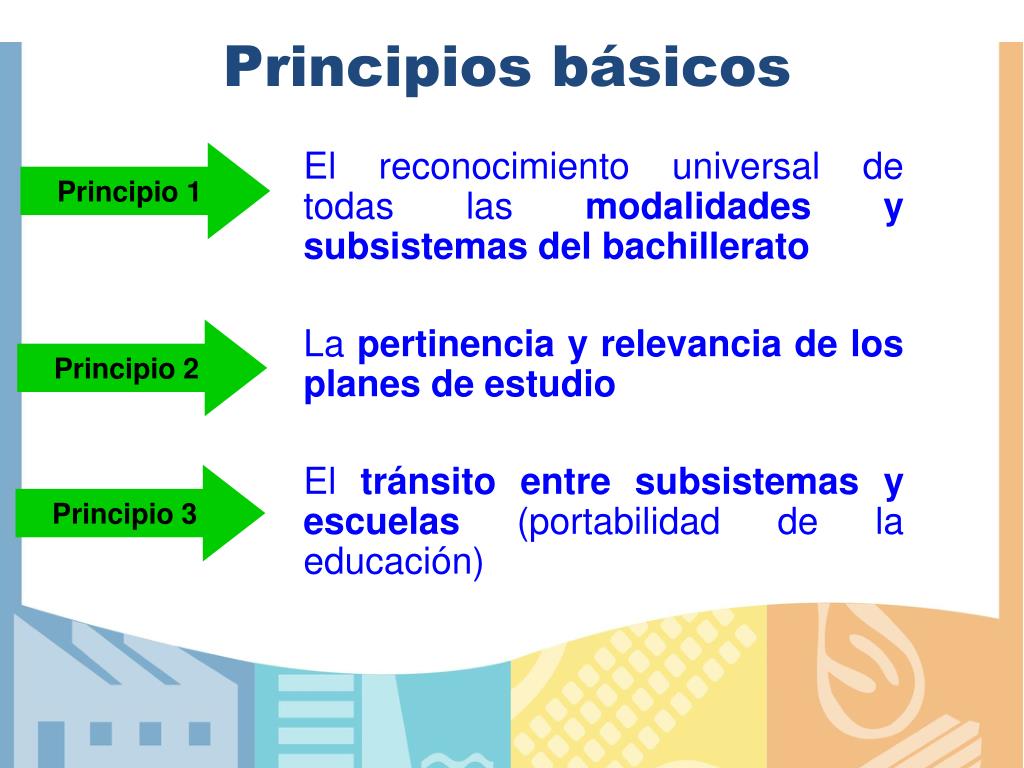 Principios básicos Principio 1 El reconocimiento universal de todas las modalidades y subsistemas del bachillerato La pertinencia y relevancia de los planes de estudio El tránsito entre subsistemas y escuelas (portabilidad de la educación) Principio 2 Principio 3
