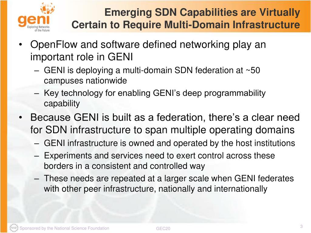 Emerging SDN Capabilities are VirtuallyCertain to Require Multi-Domain Infrastructure • OpenFlow and software defined networking play an important role in GENI • GENI is deploying a multi-domain SDN federation at ~50 campuses nationwide • Key technology for enabling GENI’s deep programmability capability • Because GENI is built as a federation, there’s a clear need for SDN infrastructure to span multiple operating domains • GENI infrastructure is owned and operated by the host institutions • Experiments and services need to exert control across these borders in a consistent and controlled way • These needs are repeated at a larger scale when GENI federates with other peer infrastructure, nationally and internationally