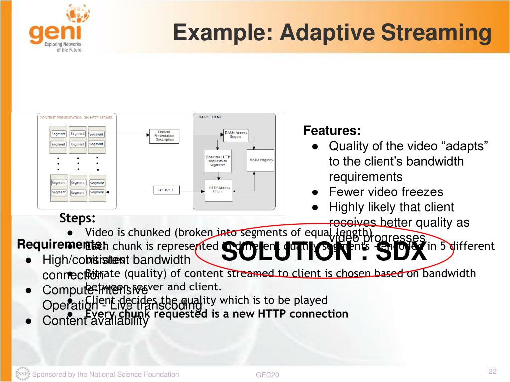 Example: Adaptive Streaming Features: • Quality of the video “adapts” to the client’s bandwidth requirements • Fewer video freezes • Highly likely that client receives better quality as video progresses SOLUTION : SDX Steps: • Video is chunked (broken into segments of equal length) • Each chunk is represented in different quality segments - encoded in 5 different bitrates • Bitrate (quality) of content streamed to client is chosen based on bandwidth between server and client. • Client decides the quality which is to be played • Every chunk requested is a new HTTP connection Requirements: • High/consistent bandwidth connection • Compute-intensive Operation - Live transcoding • Content availability