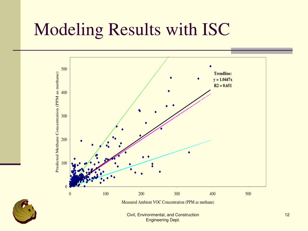 CALPUFF vs AERMOD • We spent considerable time making dispersion modeling runs with each program • Results are different from each other, but without actual off-site monitoring data, we cannot tell which is “right” • Choice was made based on reports of accuracy in the literature and ease-of-use considerations • And the winner is…. Civil, Environmental, and Construction Engineering Dept.