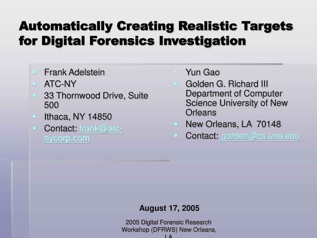 Frank Adelstein ATC-NY 33 Thornwood Drive, Suite 500 Ithaca, NY 14850 Contact: frank@atc-nycorp.com Yun Gao Golden G. Richard III Department of Computer Science University of New Orleans New Orleans, LA 70148 Contact: golden@cs.uno.edu Automatically Creating Realistic Targets for Digital Forensics Investigation August 17, 2005 2005 Digital Forensic Research Workshop (DFRWS) New Orleans, LA