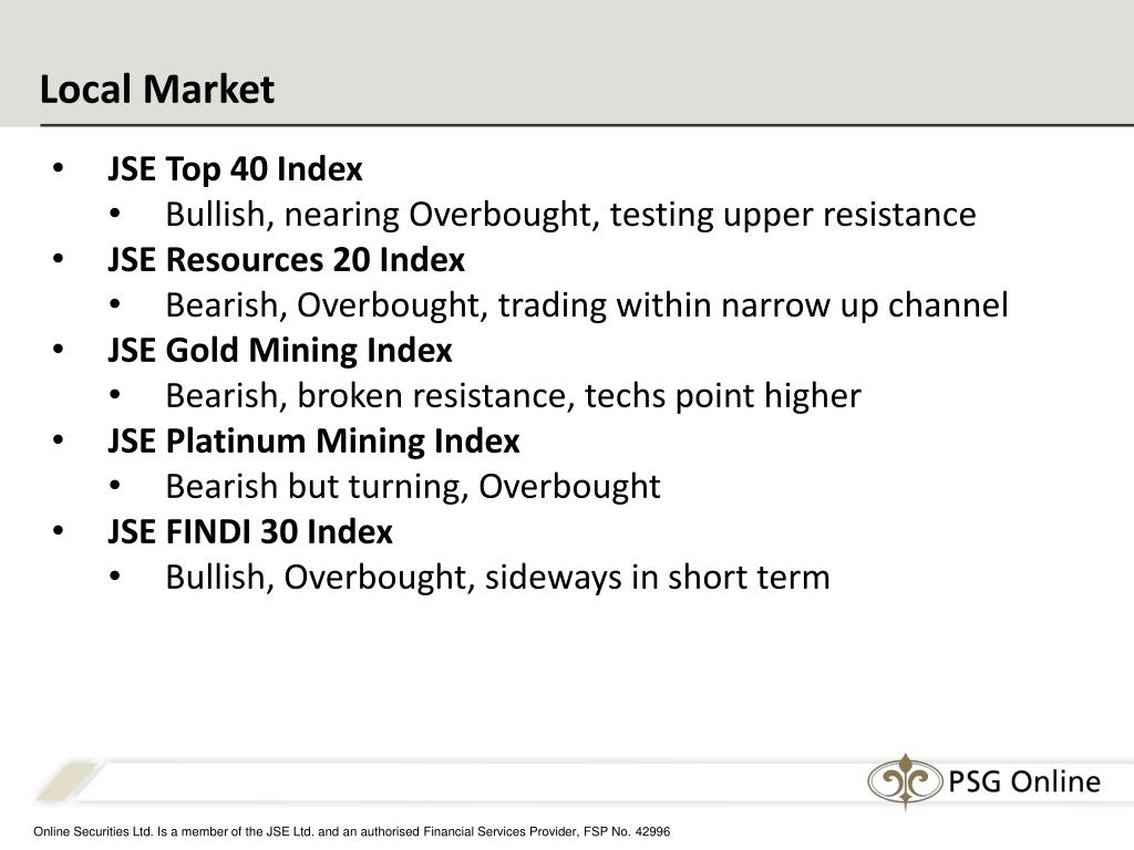Local Market • JSE Top 40 Index • Bullish, nearing Overbought, testing upper resistance • JSE Resources 20 Index • Bearish, Overbought, trading within narrow up channel • JSE Gold Mining Index • Bearish, broken resistance, techs point higher • JSE Platinum Mining Index • Bearish but turning, Overbought • JSE FINDI 30 Index • Bullish, Overbought, sideways in short term