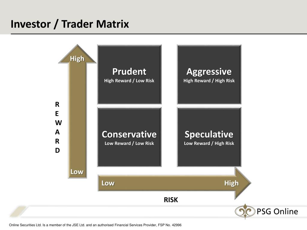 Investor / Trader Matrix Prudent High Reward / Low Risk Aggressive High Reward / High Risk High R EWARD Conservative Low Reward / Low Risk Speculative Low Reward / High Risk Low Low High RISK