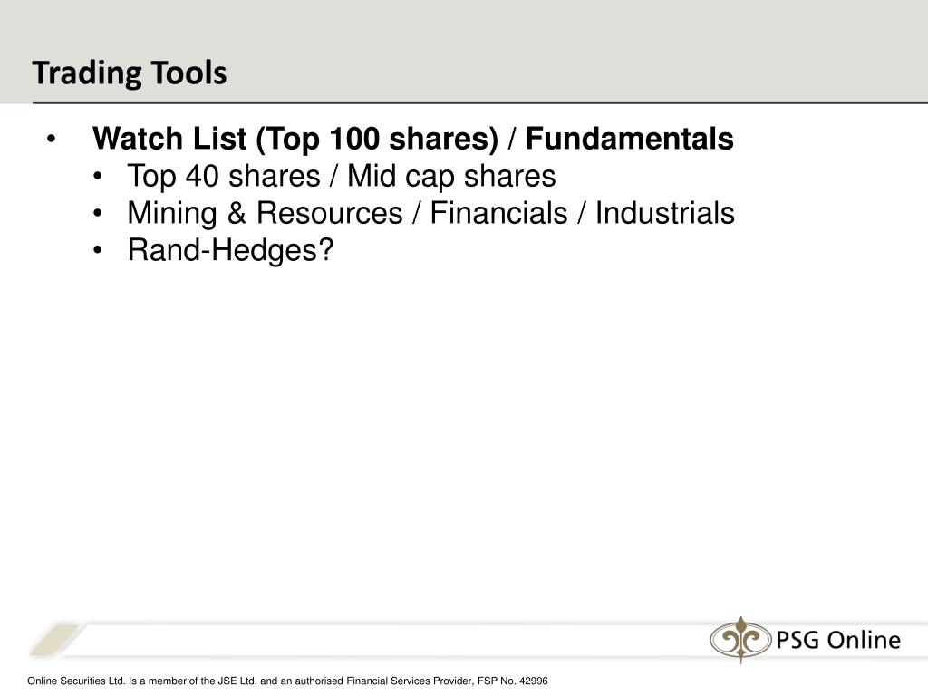 Trading Tools • Watch List (Top 100 shares) / Fundamentals • Top 40 shares / Mid cap shares • Mining & Resources / Financials / Industrials • Rand-Hedges?