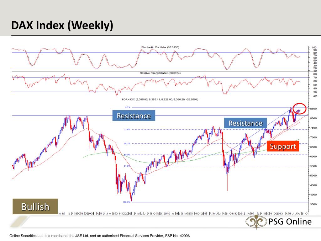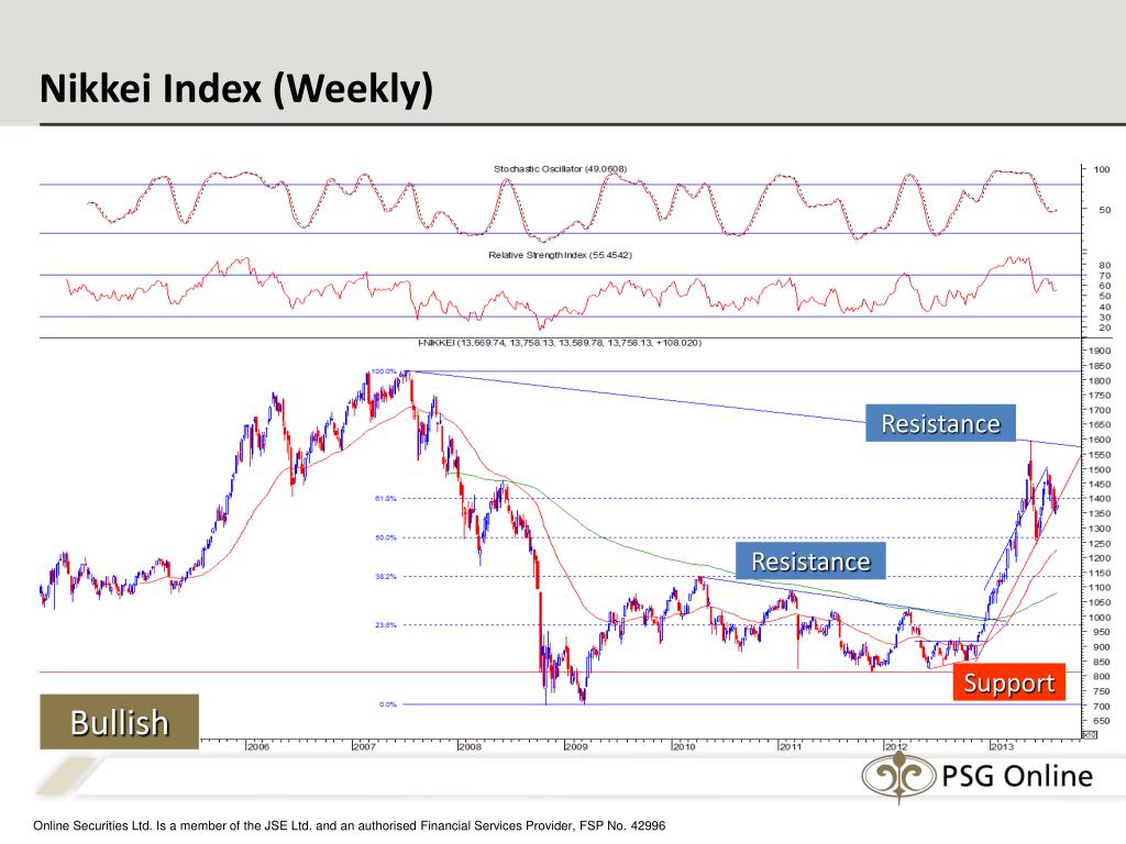 Major International Markets • S&P 500 Index • Bullish, Overbought, moving towards support • Hang Seng Index • Bullish, moving towards resistance (triangle) • Nikkei Index • Bullish, techs pointing lower, testing support • DAX Index • Bullish, moving upwards within up channel • FTSE 100 Index • Bullish, mixed techs, lower cyclical high