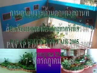 การเตรียมงานด้านตกแต่งสถานที่การเตรียมงานด้านตกแต่งสถานที่ สำหรับงานตลาดนัดหลักสูตรครั้งที่ 9 PAYAP EDUCATION FAIR 2005 7 - 8 กรกฎาคม 2548