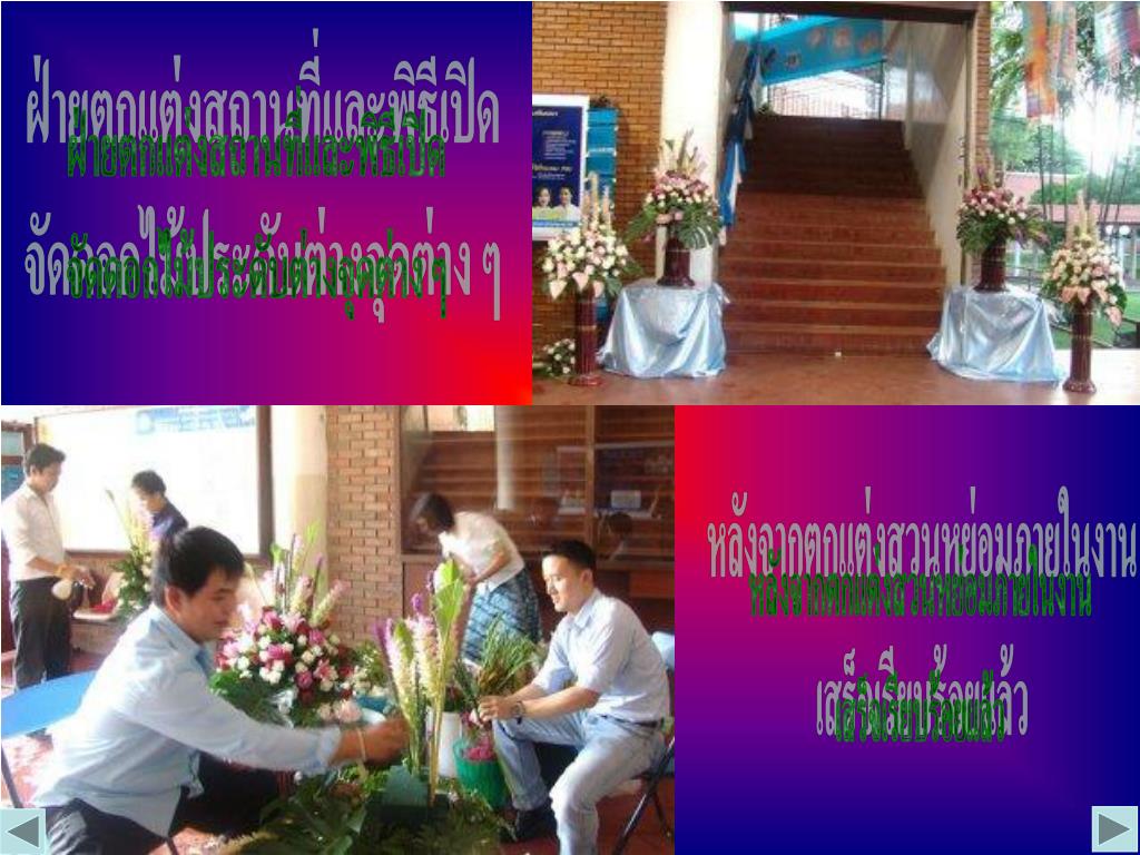 ฝ่ายตกแต่งสถานที่และพิธีเปิดฝ่ายตกแต่งสถานที่และพิธีเปิด จัดดอกไม้ประดับต่างจุดต่าง ๆ หลังจากตกแต่งสวนหย่อมภายในงาน เสร็จเรียบร้อยแล้ว