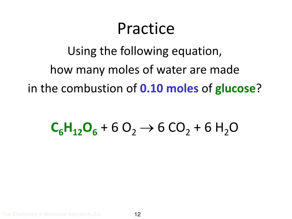 Practice Using the following equation, how many moles of water are made in the combustion of 0.10 moles of glucose? C6H12O6 + 6 O2® 6 CO2 + 6 H2O Tro: Chemistry: A Molecular Approach, 2/e 12