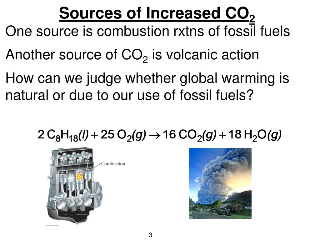 Sources of Increased CO2 One source is combustion rxtns of fossil fuels Another source of CO2 is volcanic action How can we judge whether global warming is natural or due to our use of fossil fuels? 3