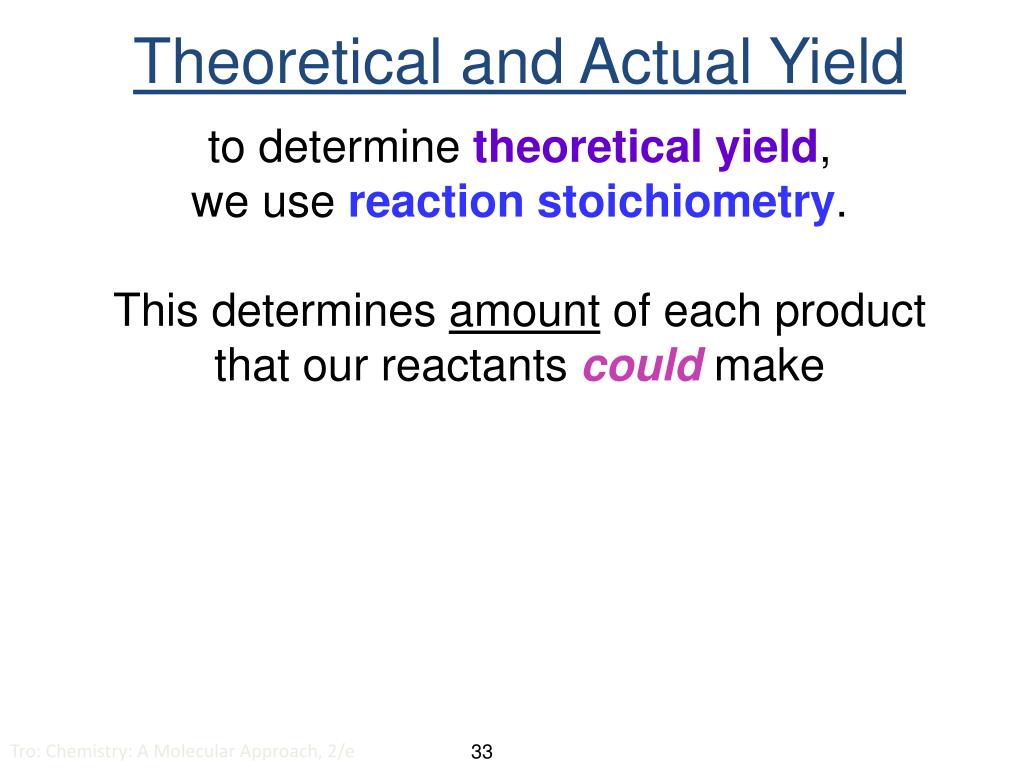 Theoretical and Actual Yield to determine theoretical yield, we use reaction stoichiometry. This determines amount of each product that our reactants could make Tro: Chemistry: A Molecular Approach, 2/e 33