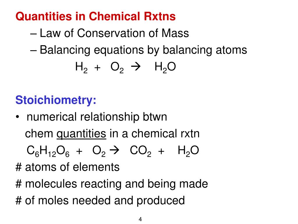 Quantities in Chemical Rxtns Law of Conservation of Mass Balancing equations by balancing atoms H2 + O2 H2O Stoichiometry: numerical relationship btwn chemquantities in a chemical rxtn C6H12O6 + O2 CO2 + H2O # atoms of elements # molecules reacting and being made # of moles needed and produced 4