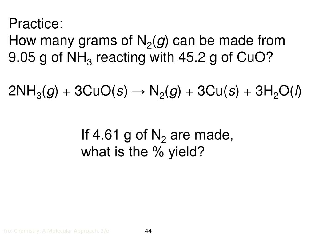 Practice:How many grams of N2(g) can be made from 9.05 g of NH3 reacting with 45.2 g of CuO?2NH3(g) + 3CuO(s) → N2(g) + 3Cu(s) + 3H2O(l) Tro: Chemistry: A Molecular Approach, 2/e 44