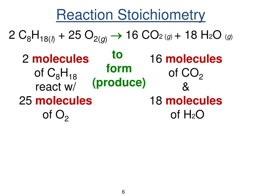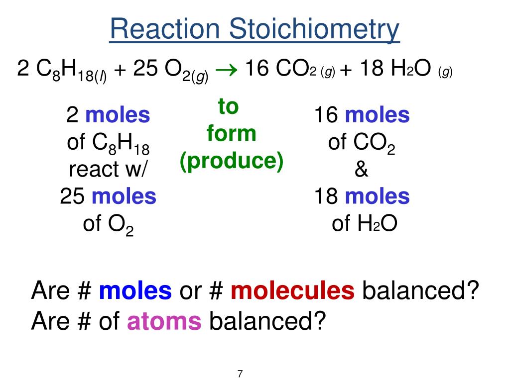 Reaction Stoichiometry • 2 C8H18(l) + 25 O2(g) 16 CO2(g) + 18 H2O (g) to form (produce) • 2 molecules • of C8H18 • react w/ 25 molecules • of O2 16 molecules of CO2 & 18 molecules of H2O 6