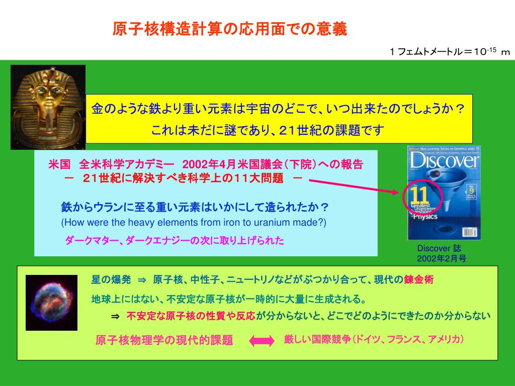原子核物理学の現代的課題 厳しい国際競争(ドイツ、フランス、アメリカ) 原子核構造計算の応用面での意義 1 フェムトメートル=10-15m 金のような鉄より重い元素は宇宙のどこで、いつ出来たのでしょうか? これは未だに謎であり、21世紀の課題です 米国 全米科学アカデミー 2002年4月米国議会(下院)への報告 - 21世紀に解決すべき科学上の11大問題 - 鉄からウランに至る重い元素はいかにして造られたか? (How were the heavy elements from iron to uranium made?) ダークマター、ダークエナジーの次に取り上げられた Discover 誌 2002年2月号 星の爆発 ⇒ 原子核、中性子、ニュートリノなどがぶつかり合って、現代の錬金術 地球上にはない、不安定な原子核が一時的に大量に生成される。 ⇒ 不安定な原子核の性質や反応が分からないと、どこでどのようにできたのか分からない
