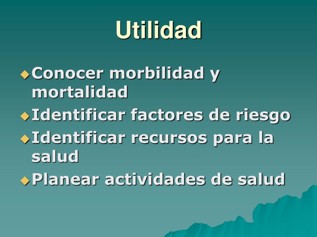 Utilidad • Conocer morbilidad y mortalidad • Identificar factores de riesgo • Identificar recursos para la salud • Planear actividades de salud
