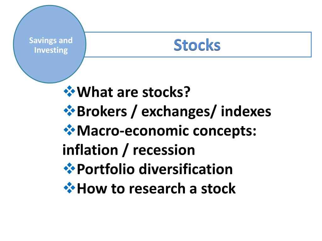 Stocks • Savings and Investing • What are stocks? • Brokers / exchanges/ indexes • Macro-economic concepts: inflation / recession • Portfolio diversification • How to research a stock
