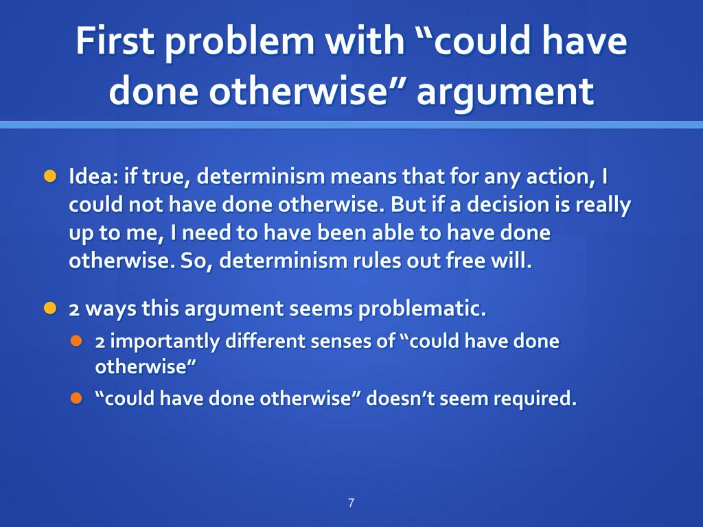 First problem with “could have done otherwise” argument • Idea: if true, determinism means that for any action, I could not have done otherwise. But if a decision is really up to me, I need to have been able to have done otherwise. So, determinism rules out free will. • 2 ways this argument seems problematic. • 2 importantly different senses of “could have done otherwise” • “could have done otherwise” doesn’t seem required.