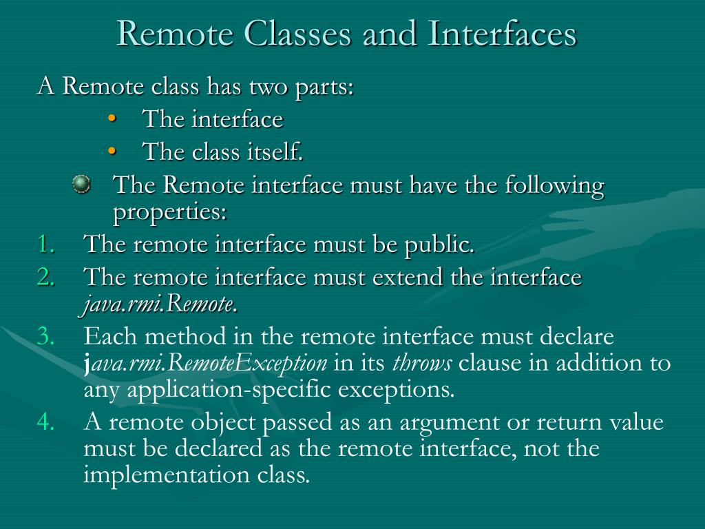 Remote Classes and Interfaces A Remote class has two parts: • The interface • The class itself. • The Remote interface must have the following properties: • The remote interface must be public. • The remote interface must extend the interface java.rmi.Remote. • Each method in the remote interface must declare java.rmi.RemoteExceptionin its throwsclause in addition to any application-specific exceptions. • A remote object passed as an argument or return value must be declared as the remote interface, not the implementation class.